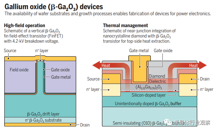必須仔細(xì)考慮Ga2O3極低的導(dǎo)熱系數(shù)(11到27 W m-1K-1)。Ga2O3晶體管的冷卻甚至比GaN晶體管更關(guān)鍵,后者也有自熱效應(yīng)。盡管Ga2O3器件在運行過程中輸出的功率與GaN器件相比仍然要低一個數(shù)量級,但為GaN開發(fā)的頂部和底部側(cè)冷卻方法可以應(yīng)用于Ga2O3。事實上,用AlN或納米晶金剛石覆蓋橫向晶體管可以實現(xiàn)Ga2O3 5-6w mm-1的直流輸出功率,這與20世紀(jì)90年代GaN高電子遷移率晶體管的早期結(jié)果類似。具有高導(dǎo)熱性的異質(zhì)集成WBG p型半導(dǎo)體,如SiC, GaN,甚至金剛石,尤其適用于p-n和結(jié)勢壘肖特基整流器。